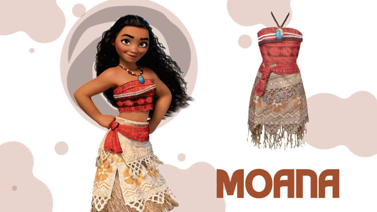 Moana’s ensemble is inspired by traditional Polynesian culture, made from tapa cloth or bark cloth, it features intricate patterns and designs.